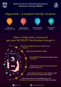Vidhyarthi portal developed by NIC Bhubaneswar is used by SCTE&VT for all exam related online activities & publication of result. Students can obtain and download their marksheet,certificate and result by the help of this application by simply submitting their registration number or roll no. The faculties of various institution accredited by SCTE&VT can uploaded the internal & sessional marks of the students through this software.